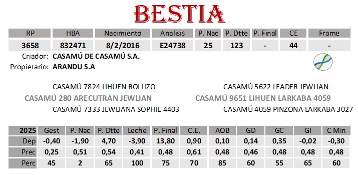 Gran toro colorado criado por Casamú, adquirido por Arandú. Excelente hijo de Lihuenen una madre Rollizo. Un súper toro probado para su uso en vaquillonas de 15 meses, el Bestia es el padre del Precio Máximo del Remate de Rústicos Premium 2021, un toro de gran producción en Arandú un verdadero padre; para usarlo tanto en rodeos comerciales, como en rodeos puro controlados y puros de Pedigree. Bestia logra madres longevas, fértiles y toros bien clasudos, musculosos en un tamaño moderado. La calidad de su semen es superlativa. Un toro moderado, muy musculoso, con notable cabeza que imprime a su descendencia, facilidad de parto, con muy buenos números. Use Bestia y asegurese sus terneros en sus vaquillonas.