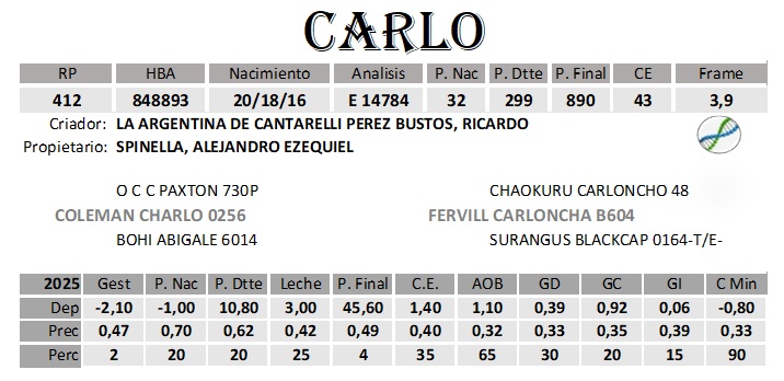 | UN TORO BIEN VAQUILLONERO CON TODA LA CALIDAD DEL ANGUS TRADICIONAL. Súper completo desde todo punto de vista: deps, números, fenómica. Hasta un chorrito de sangre escocesa lo respalda con la mejor familia de Surangus y Leachman detrás, la más famosa para producir padres para facilidad de parto. Un toro completo, bien carnudo, balanceado, blando, masculino, correcto por todos lados. Su prueba genómica da muy bien para conversión y frame. |
