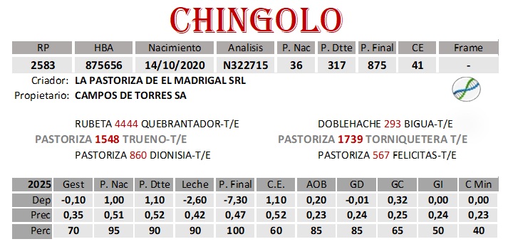 | UN COLORADO EXTREMADAMENTE COMPLETO Calidad racial, en su cabeza, color, línea superior e inferior totalmente limpia, volumen, blandura y perfecto desplazamiento. Esto combinado con una carga genética muy sólida, su padre TRUENO ya consagrado, y su madre TORNIQUETERA, una de las donantes más importantes de La Pastoriza, su producción este año realmente sobresaliente con todos los padres que se lavo. Un nuevo padre colorado. | |||||||||||||||||