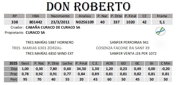 | FENOTIPO IMPONENTE DONDE SE DESTACA SU GRAN CALIDAD RACIAL, LARGO, PROFUNDIDAD, CORRECCIÓN, ANCHO, FUNCIONALIDAD Y EXCELENTES TESTÍCULOS Y FERTILIDAD. Rodeado por un pedigree excepcional, sin duda uno de los mejores hijos de Zorzal, sobre la 39 (dos años seguidos 2º Madre del Año de la Raza) y nieto de la vaca fundadora de la cabaña, Sorpresa, de la cual desciende el 75% del plantel de Curacó. Propio hermano de Jacinto, dos veces Reservado Gran Campeón Macho de Palermo 2012- 2013 y gran padre. Sus propias hermanas son las donantes líderes de la cabaña, con cuyas primeras crías obtienen La Gran Campeón Hembra Nacional del Ternero 2014 y Lote Reservado Gran Campeón. | |||||||||||||||||