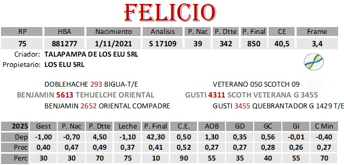 | Es gratificante encontrar un futuro padre de este calibre. Compitió en la Nacional primavera 2022, donde fue Campeón Ternero Intermedio, Mejor Ternero Colorado y Tercer Mejor Ternero Nacional, en 2023 en la Nacional de Otoño, fue Reservado Campeón Junior, pero lo más importante es que es básicamente Toro pastoril, con muchísima blandura, correcto por donde uno lo mire, calidad racial, tanto en su cabeza como en su tipo de musculatura. Su genealogía, confirma lo antes dicho, casi un sueño, su padre TOLUCA ya un clásico de 15 meses y de gran producción, por parte de madre, su abuelo materno SCOTCH otro legendario indiscutido, atrás QUEBRANTADOR y para no olvidarnos de las damas, TRES MARIAS SECRETARIA. Con esta potencia genética y física, creo, más bien afirmo no nos podemos equivocar. Gracias a Fernando Eluchans por apoyarnos, permitiendo que todos podamos disponer de este privilegio y a nuestro amigo Gustavo Salvini por producir su madre. Con sus números y genética seguramente un toro de 15 meses asegurado. | |||||||||||||||||