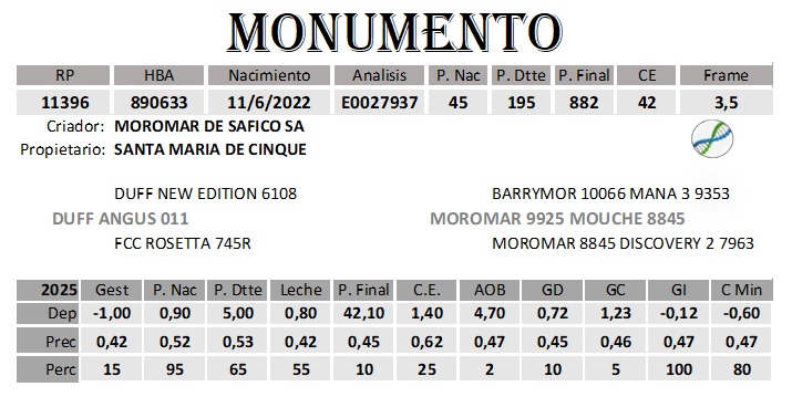 | Un toro muy prolijo, con un buen manto muscular, bien aplomado, linda cabeza y buen arco costal. Sus Epds sumamente balanceados, con muy buen Peso Final y una impresionante Área de Ojo de Bife. En su pedigree se destacan grandes padre raza como Mr Angus, Mana Classic, OCC Discovery y Gendarme. Otro importante Toro de Moromar de Safico, adquirido por Santa Marta de Cinque, con excelente semen y ya en servicio en el campo. |