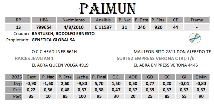Un Pedigree ideal, su padre Sólido, dio gran uniformidad, es hijo de Líder con una vaca de BRU. Su madre tiene líneas maternas de las más buscadas, hija de Catriel por madre, con línea Rainmaker. Toda su genealogía combina toros de bajo peso al nacer y muy buena producción.