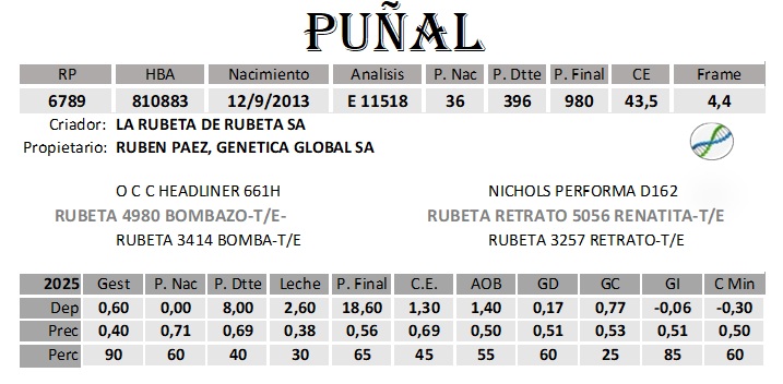 | EL SUCESOR INDISCUTIDO DEL GRAN BOMBAZO. Da facilidad de parto en 18 meses, con un excelente desarrollo. Une musculatura, estructura y calidad en toda su descendencia. Esta uniformidad en sus hijos e hijas es sostenida por tremendo pedigree, el ya legendario Bombazo por la Renatita 5056, consolidada por toda su producción. Números positivos en toda su grilla, desde destete, leche, final, CE, hasta carcasa. Facilidad de parto con buen desarrollo. |