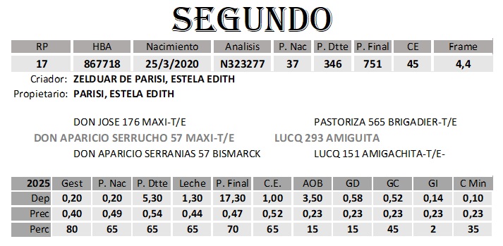 | Gran hijo del consagrado Bi Campeón de Palermo Serrucho en Amiguita, vaca proveniente de San José de Lagrange; hija de Brigadier. Destacado pedigree portador de gen colorado. Segundo es un toro de tamaño moderado, de excelente calidad racial y sus primeras crías se destacan por ser de lindas cabezas, hembras muy femeninas y machos con gran sello racial, mucho hueso y blandos de engorde. Use SEGUNDO para imprimir toda la clase del Angus a sus rodeos, lograr hembras femeninas y longevas. |