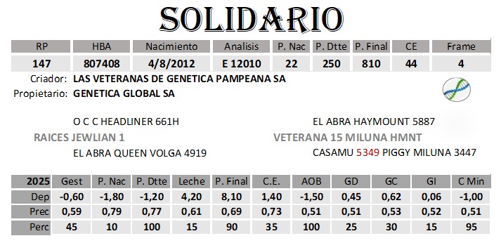 Todo esto hace de Solidario un Toro seguro y confiable, que acrecienta la calidad y productividad de todo rodeo.