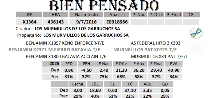 | Bi Gran Campeón de Palermo 2018 y 2019. Su hermano completo Bi Gran Campeón Palermo 2024 y Centenario de Hereford 2024. Uno de los toros más probados en los últimos años. Produjo ya innumerables campeones, puros de pedigrees y puros registrados, que se siguen sumando día a día, en los mejores criadores y en todas las pistas del país. Impacta ver la uniformidad de su producción: excelente calidad racial, perfectos aplomos, muy buen manto de carne, blandos de engorde, animales sumamente funcionales y productivos a campo. Agradecemos a Cabaña Los Murmullos, por compartir con nosotros un Toro de tan alto nivel. BIEN PENSADO, un PADRE garantizado. |