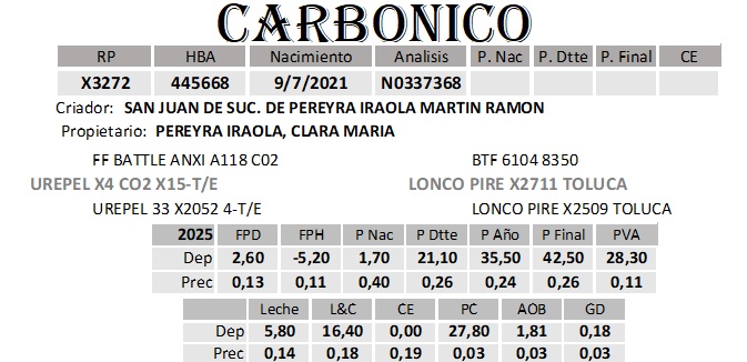 | Hijo de Dióxido de Carbono (Hijo del CO2 de Fowkens Farm) en nuestra legendaria X2711 (Alabama X El Inglés). Carbónico participó en la Tercera Pastoril Bonaerense, donde se destacó en varias de las características evaluadas, saliendo al tope del lote en ganancia diaria y calidad seminal y en la 2da jura fenotípica salió primero. Los terneros lucen muy buen color, pigmento ocular y son realmente gruesos y bien clasudos. Un pack de números excelentes en el PEG ( Facilidad de Partos + Bajo Peso al Nacer + Crecimiento + Carcasa + Negativo en Peso de vaca Adulta ), que acompañan al gran desempeño REAL que demostró en la Pastoril Bonaerense. En definitiva, un buen toro de pedigree Pampa…No está nada fácil para conseguir uno bueno en serio, ¡CREEMOS QUE ESTE LO ES! | |||||||||||||||||