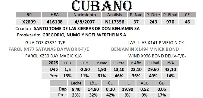 | HUESO, PROFUNDIDAD, ESTRUCTURA, CIRCUNFERENCIA ESCROTAL Y GRANDES MASAS MUSCULARES. Ver a Cubano con el volumen, estructura y carne que tiene, y desplazarse como un ternero realmente impacta. Un toro de tamaño mediano, con DEP’S para PD y PA sobresalientes, gran Circunferencia escrotal, blando de engorde con números de merito de carcasa inmejorables, estando entre los TOP 10% superiores de la raza. Gran calidad racial y carácter de macho. Su pedigree, conjugando Satanás con lo mejor de Las Lilas, es intachable. Todo ésto hace de Cubano una muy importante opción en Hereford. | |||||||||||||||||