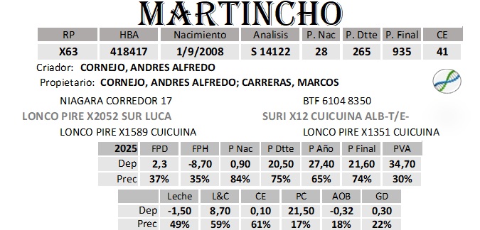 | FACILIDAD DE PARTO, COLOR Y PIGMENTACIÓN. Martincho es ideal para planteos de criadores exigentes, con bajo peso al nacer y facilidad de parto, buenos números para características de carniceras. Muy mantenido, de fácil engorde, rústico. Su pedigree, netamente de facilidad de parto y producción, lo vemos reflejado en todas sus crías, que son sumamente uniformes, con nacimientos muy pequeños, y luego un muy buen desarrollo al destete y al año, gran adaptabilidad a medios exigentes, las hembras son excelentes madres. |