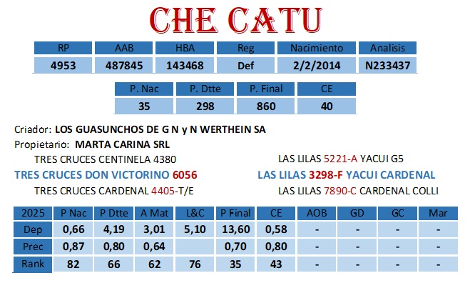 Combina DEP´s muy balanceados, buen Peso al Nacer, Peso al Destete y sobre todo Peso Final con una excelente Circunferencia Escrotal.