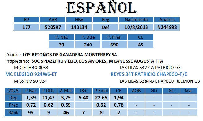 Toro de tremendo volumen de carne, con gran capacidad ruminal, facilidad de engrasamiento con buena disposición de la misma, excelente prepucio, notable mansedumbre y 45 cm de circunferencia escrotal.