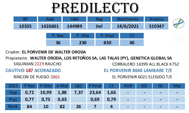 | Reservado Gran Campeón Mundial 2023. Jurado Carlos Ojea Rullan. Reservado Gran Campeón Nacional 2024. Jurado Javier Ezcurra. Este Toro demostró, por más de 2 años, estar en la cúspide de todos los machos de la raza Brangus. Por este Padre ÚNICO, hicimos un importantísimo esfuerzo, junto con Los Retoños y Las Talas, para poder compartirlo con todos los criadores. Impacta en su calidad, largo, carne, volumen y expresión. Prepucio perfecto y gran ancho de lomo. Su Padre CAUTIVO le da un buen grado de acebuzamiento. Su Madre EL PORVENIR 8640 (Lambare x Elegido), importante donante, viene por las 406 (Gladiador) una de las fundadoras de esta Gran Cabaña. Sus primeras crías demuestran toda la potencia física y genealógica de este Imponente Padre. |