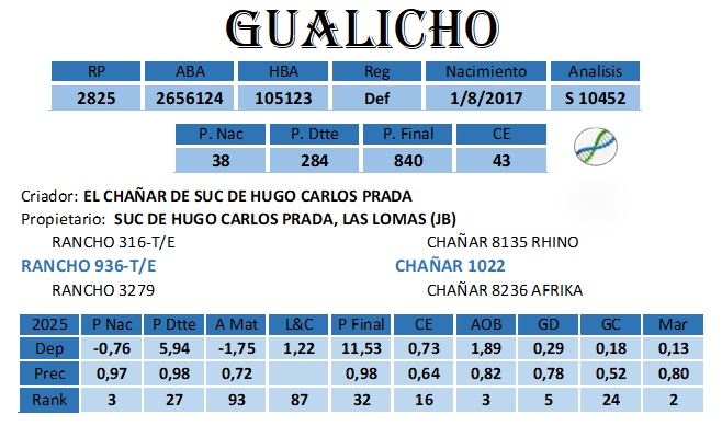 Gualicho, fue Campeón Ternero y Gran Campeón Macho en la Exposición de Mercedes. Hijo de Mágico (Magno x Kachapé). Su madre Rwanda, fue Gran campeón Ternera en la Nacional, hija de Rhino con África (A Rum), que fue Campeón Ternera y su abuela Suheli fue Rda Gran Campeona y Precio Máximo ambas en la Expo Internacional de Uruguaiana.