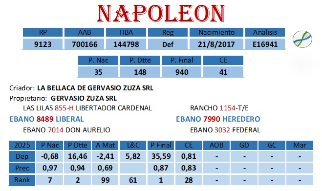 Su padre, Julio César, hijo de Liberal con la legendaria Ébano 7014, hija de Don Aurelio, vaca que todos los años produce lo más destacado de la camada. Su madre, la Ébano 7990, hija de Heredero, y por abajo Federal.